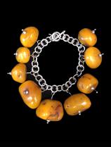 One-of-a-kind necklace with sterling silver links and toggle combined with large Tibetan amber beads and silver "bits". Handmade ancient contemporary jewelry.